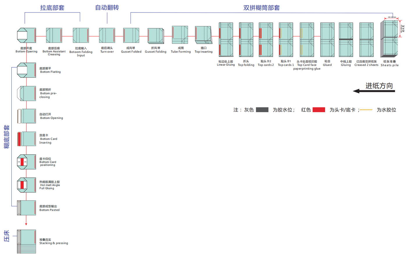 經(jīng)過特殊的機(jī)械結(jié)構(gòu)和電氣配合,一次性完成紙袋成型,紙張上膠、粘合、折袋口, 糊筒,折底,放底卡, 底部上膠封合等工藝;改變了以往大紙袋需手工加工制作;